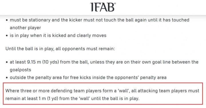 IFAB官方规则写明:当三名或三名以上防卫 队员组成“人墙”时,所有攻击 队员必须距离“人墙”至少1米,直至赛事 重新开始。