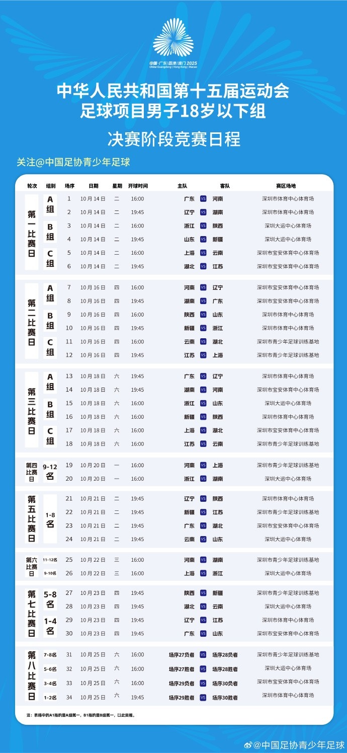 全运会U18男足总决赛 阶段第六赛事 日和第七赛事 日对阵表