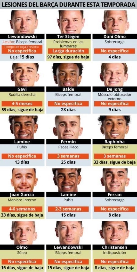 这使巴萨近期不堪重负的伤员名单再添一位。目前,巴萨多名球员仍处于伤缺竞技状态 :特尔施特根、加维、拉菲尼亚、霍安-加西亚、奥尔莫、莱万多夫斯基、克里斯滕森,如今佩德里也加入其中。