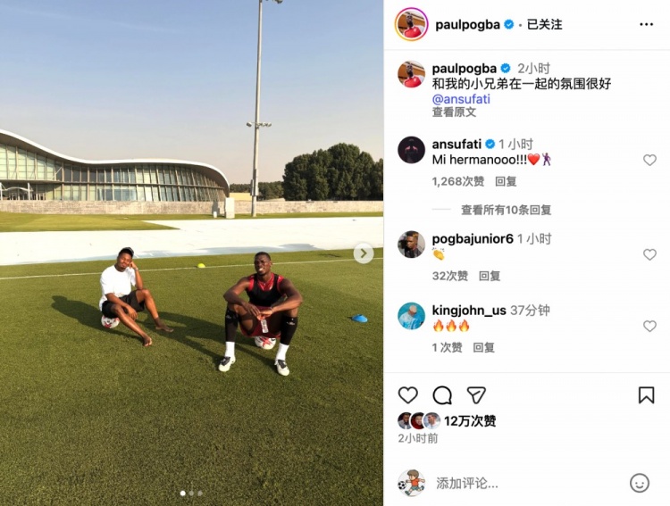 博格巴社媒晒与法蒂练习 照:和我的兄弟在一起,感觉超棒!