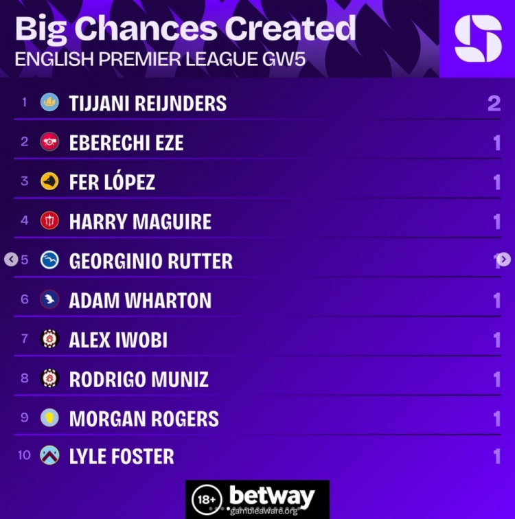 英超第5轮创重大机会榜:赖因德斯2次居首,埃泽等9名球员各1次