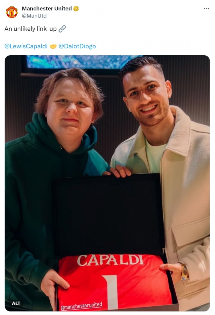 曼联社媒晒达洛特与歌手卡帕尔迪合照,后者获赠曼联运动活动 服