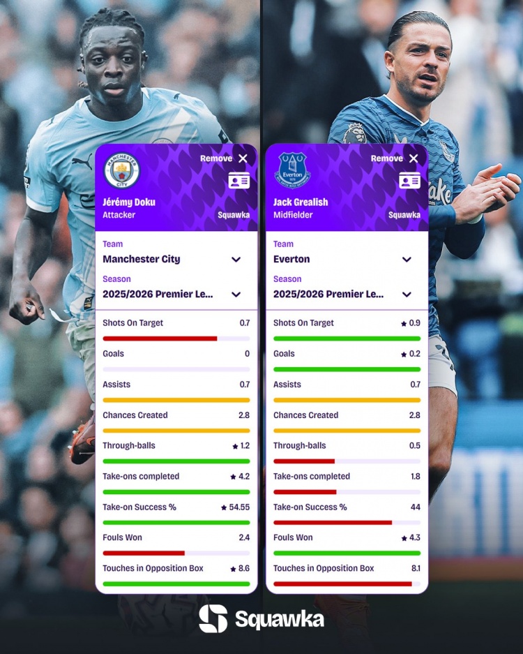 10月17日讯 北京时间明天晚上,曼城将在英超第8轮赛事 中主场作战 对阵埃弗顿,英超免费直播(无插件)Squawka统计了多库、格拉利什本赛季英超每90分钟的数据,并作出对比。