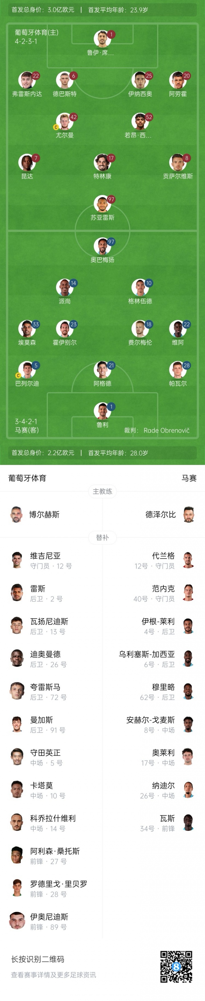 葡萄牙体育vs马赛杆位:昆达、特林康出战 格林伍德奥巴梅扬先发