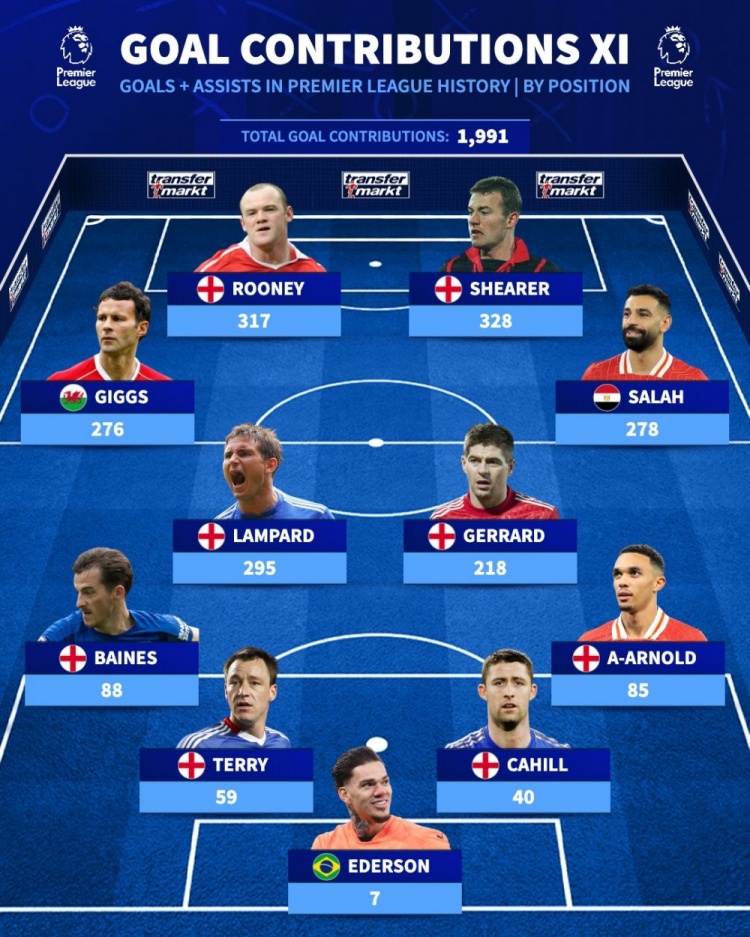 中场球员:吉格斯(276球)、兰帕德(295球)、杰拉德(218球)、萨拉赫(278球)