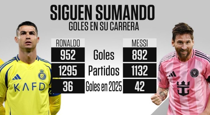 C罗生涯1295场赛事 打进952球,其中2025年打进36球;梅西生涯1132场赛事 打进892球,其中2025年打进42球。