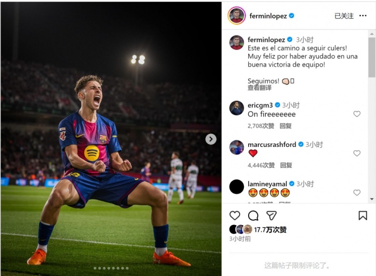 助功 双响!费尔明社媒晒热血 庆祝照片:这就是前进的方向