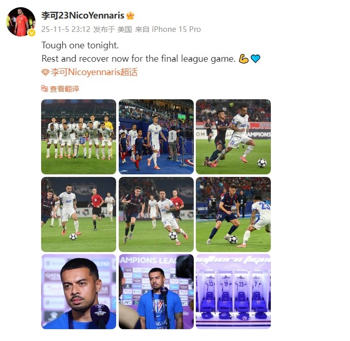 11月5日讯 亚冠精英职业联赛 第4轮,上海申花客场应战 1-3不敌柔佛新山。赛后,世界杯直播上海申花球员李可在社媒分享赛事 照片。