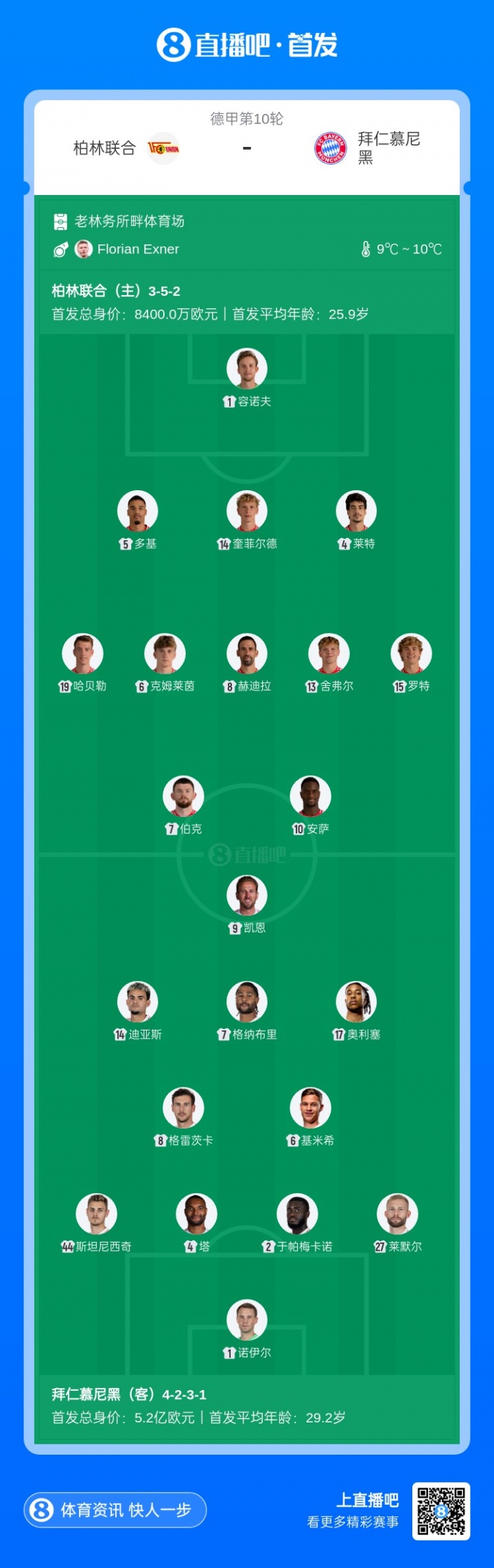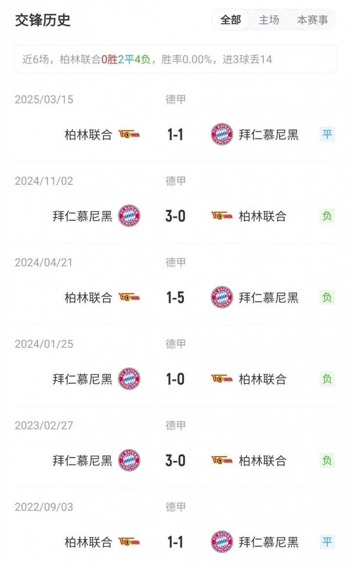 目前德甲积分榜上,拜仁9战全胜积27分,5分领跑;柏林联合3胜2平4负积11分,位列第10。
