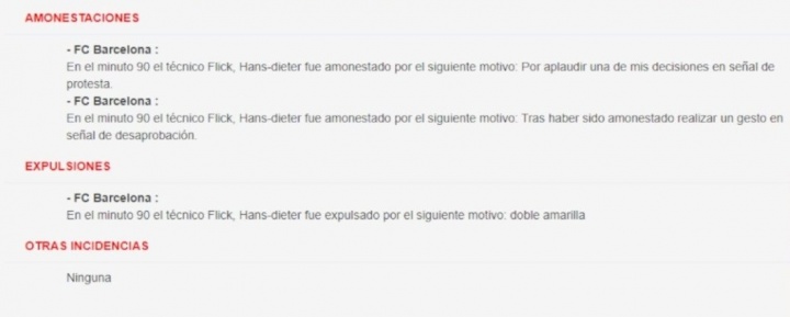 10月19日讯 西甲第9轮,巴萨2-1致胜球 赫罗纳。赛事 补时阶段,弗里克不满裁判 ,两黄变一红被罚下。赛后的裁判 报告中给出了弗里克吃牌的原因。
