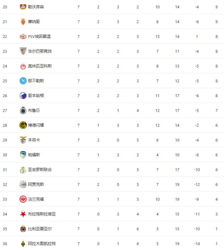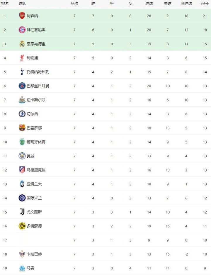 欧冠积分榜