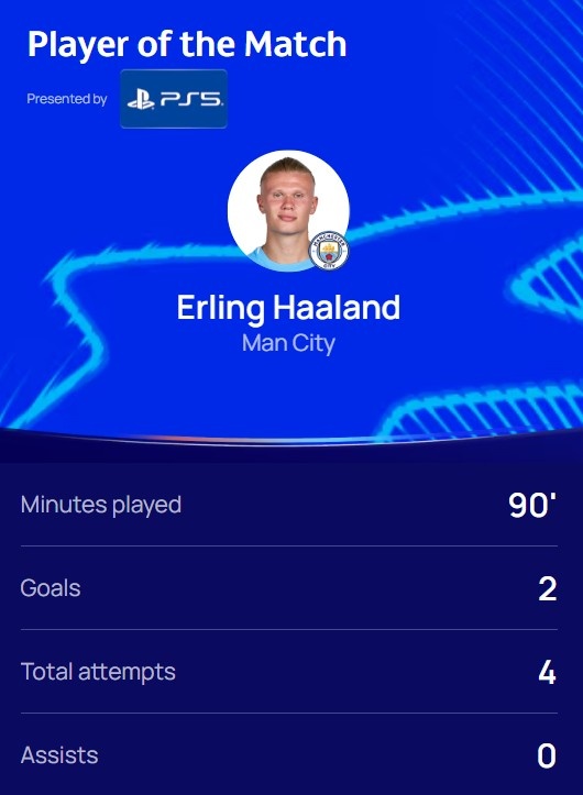 连进两球!官方:哈兰德当选曼城2-2摩纳哥全场最佳球员