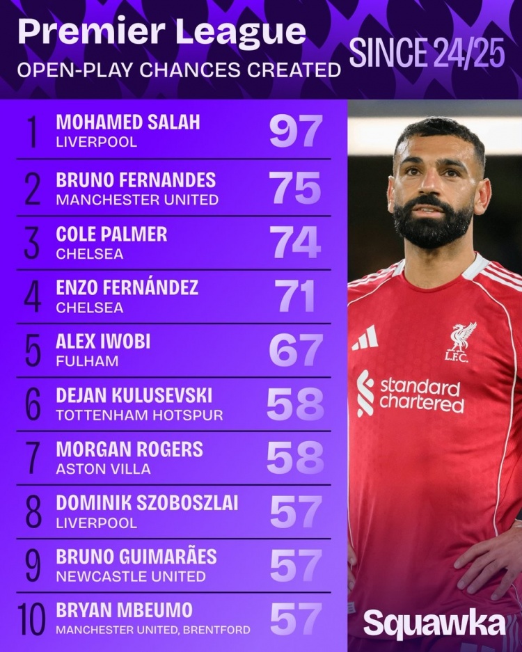 24/25赛季以来英超运动活动 战创造机会次数排行:萨拉赫居首 B费第二