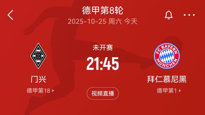 10月25日讯 官方消息,拜仁vs门兴赛事 推迟至北京时间21:45开球。