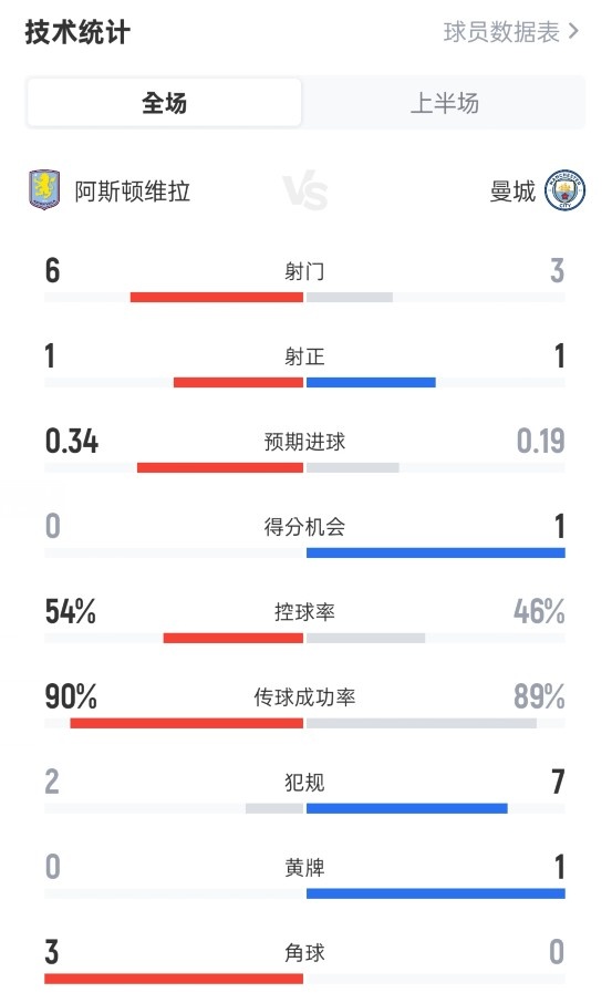 维拉半场1-0曼城数据:射球 6-3,射正1-1,盘带时间 54%-46%