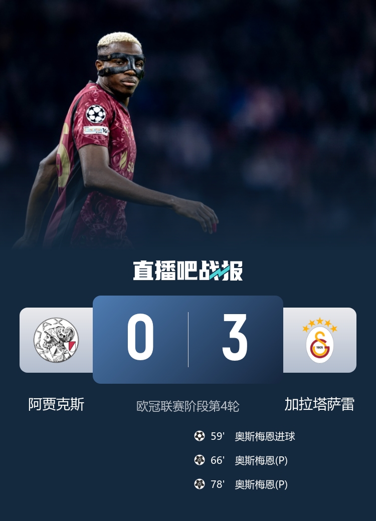 11月06日讯 欧冠职业联赛 阶段第4轮加拉塔萨雷客场应战 3-0战胜阿贾克斯,本场赛事 奥斯梅恩头顶脚踢成功实现独中三元!