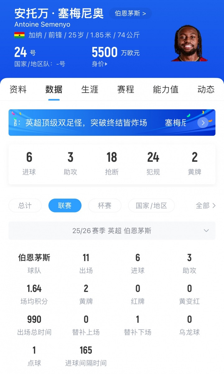 塞梅尼奥现年25岁,司职前场球员,他本赛季为伯恩茅斯出战11场英超,贡献6球3助,他与伯恩茅斯的合同将在2030年到期,现身价5500万欧。