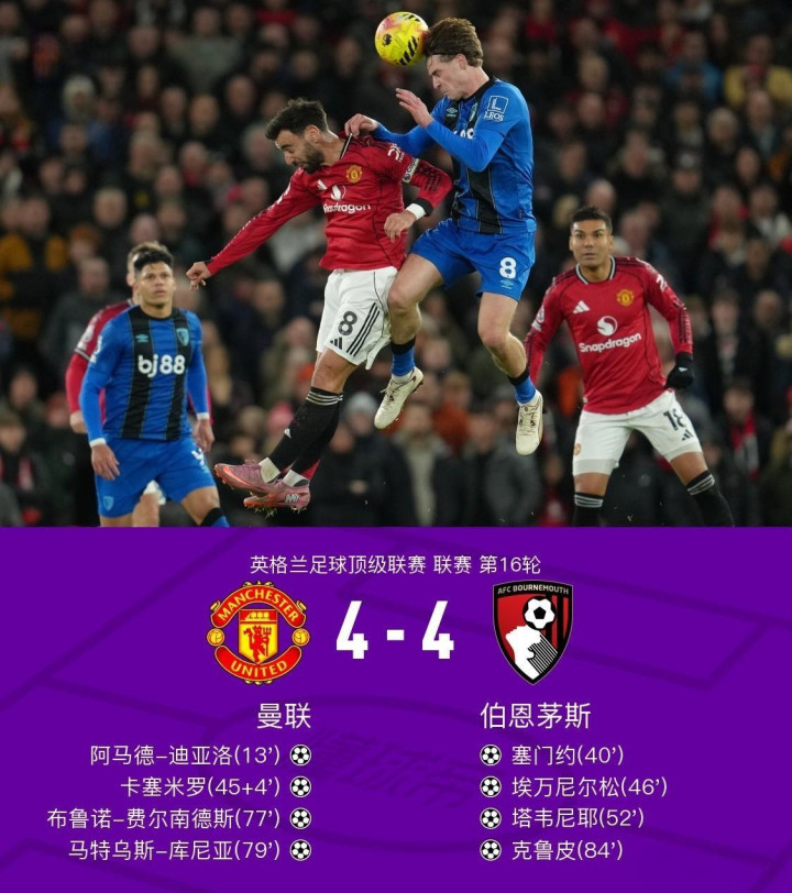 曼联4-4伯恩茅斯:得分 狂潮的背后昨晚的这场对决堪称本赛季英超最出色 的对攻大战。8个得分 ,4-4的比分,两支球队联手奉献了一场纯粹的古代足球 盛宴。赛事 从一开始就进入高速对攻节奏。第13分钟,阿马德-迪亚洛为曼联首开记录 ,但伯恩茅斯的塞门约在第40分钟快速 扳平比分。上半场补时阶段,卡塞米罗的得分 让曼联再次领跑 ,但这仅仅是得分 狂欢的开始。下半场成为真正的得分 表演。埃万尼尔松开场仅1分钟就扳平比分,塔韦尼耶第52分钟反超,布鲁诺-费尔南德斯第77分钟再度扳平,马特乌斯-库尼亚第79分钟让曼联第三次领跑 。然而伯恩茅斯展现了惊人的韧性,克鲁皮第84分钟的得分 将最终比分定格在4-4。这场赛事 暴露了曼联合防守卫 体系的严重问题,但也展现了球队强大的攻击 火力。伯恩茅斯在客场应战 拿到1分实至名归,他们的反击效率和策略 执行力值得称赞。